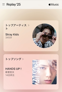 こんばんは きいです🌟 出勤しております 出勤前にひとりで鳥貴族行ってきた🐓 初かな!美味しかったー!苦しい! メガビール飲んでおつまみと焼き鳥楽しみました🎶 案外おひとりさまいるからヨユーです( ᴖ ·̫ ᴖ )✨ 話しは変わるけど Apple Music使ってる人、毎月・毎年のいちばん聴いた曲調べられるの知ってる? ふと気になって調べた🔍 スキズ様が圧倒的に一位🥇 下にある音楽はわたしが聴きたくてその曲をスタートで聴いた回数 これはワンピースの主題歌なんだけど、この歌をご本人が歌ってるところを年末に生で聴いて めちゃめちゃハマって聴いてる時期ですね笑 スキズは安定すぎるので飛ばしますね💨 わたしTikTokあんまり見ないけどインスタのリールに倍倍fightが流れてきて なにこの頭に残る曲!?となりめっちゃ聴いてた これは映画で「知らないカノジョ」観てmiletが劇中で歌ってた曲 この映画自体感動したし曲も合ってていいなーって思ってめっちゃ聴いてた スキズの写真のところが推し様です🐺笑 イイじゃんは俳優の推しと話す機会がありまして、その推しから教えてもらったやつww わたし知らなくて普通になにそれ?って言った気がするww それで気になって聴いておもろい歌やなーとなり聴いてた ここでダントツでスキズの聴いてる時間が伸びるんですが なんでだろ?と振り返ったらこの月、LIVEがあった月でめっちゃ聴いてた そんでもってSPYAIRの青はお客様からおすすめしてもらったアニメの主題歌 それがめっちゃ良くて、わたしの好きな曲調だしハマってめっちゃ聴いてた わたし影響されすぎやろっっっっ 写真にはないけど先月、11月のはtuki.の人生讃歌でした これは映画、愚か者の身分の主題歌です わかりやすい🤣🤣🤣🤣 でもひとつきだけ、いちばん聴いた歌手がスキズじゃない月があって だれー?って思うじゃないですか BTSでした😸🎶 兵役から全員帰ってきた頃かな?ww 今月のわたしのヒットソング何になるか楽しみ!!!笑 面白いからみんなも調べてみてねー!! またねーん