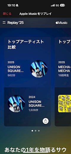 こんばんは! みなとです🫶 最近暇さえあれば AppleMusicとか YouTubeのハイライト 眺めてます😚 今年は 3774分 AppleMusic再生してたらしい🎧 多いのか少ないのかわかんない😅 でも今年はYouTube率高かったから🍎は少ないかも なんか去年と比べると 今年ユニゾン そんなに聴いてない?? って思ってたけど そういえば今年は CDプレイヤーを新調して 在宅時はそっちで再生してたかも アルバム出たりすると 聴く時間跳ね上がりそう🙂↕️ 明日出勤です❣️ ではまた👋